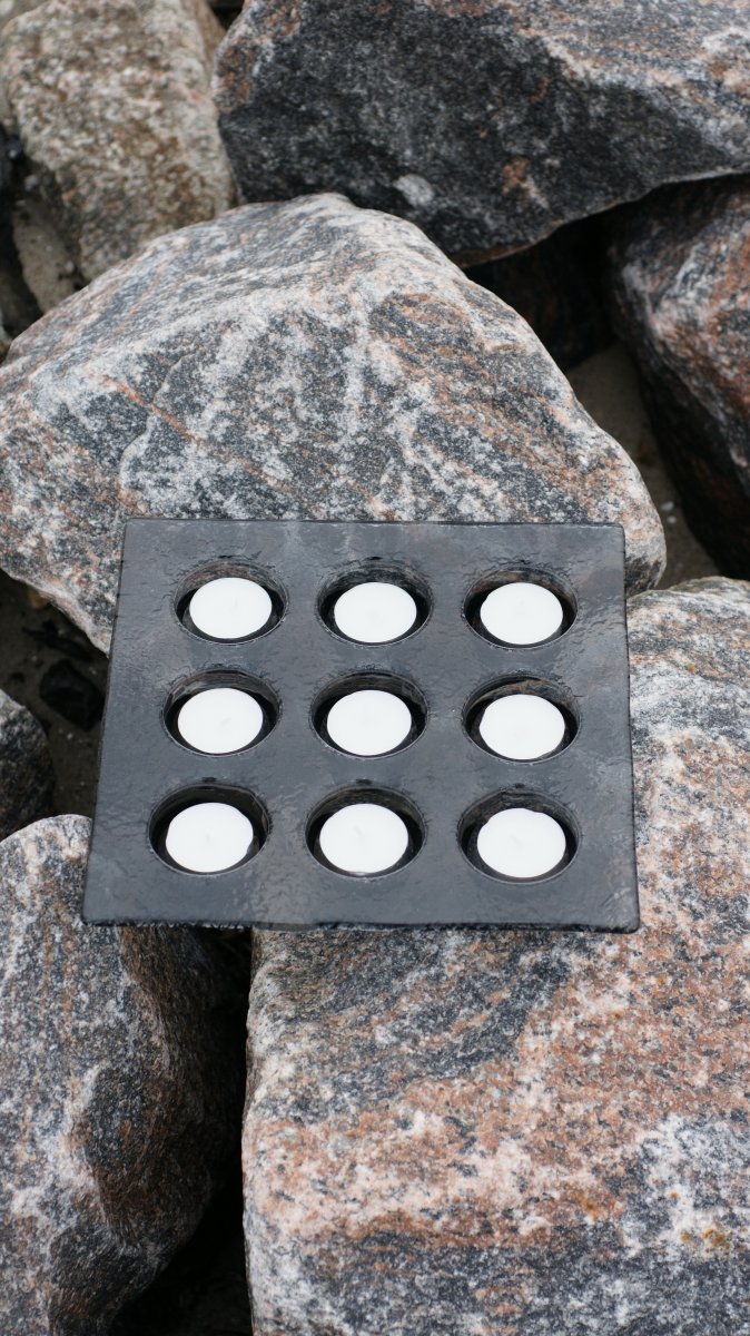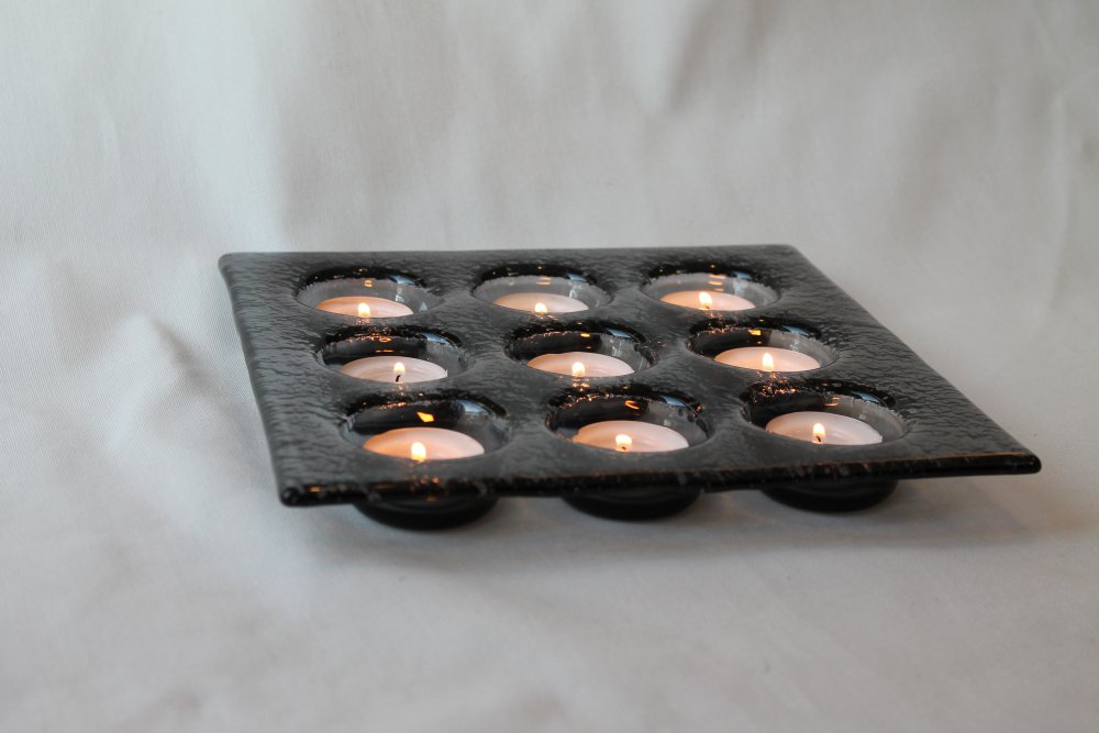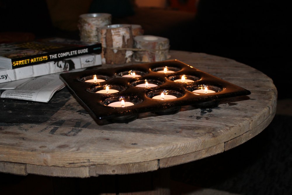 Udarbejdet i gråt klart glas med plads til f.eks. 9 fyrfadslys.